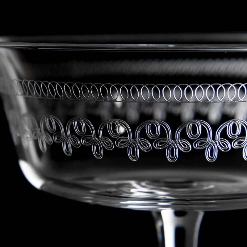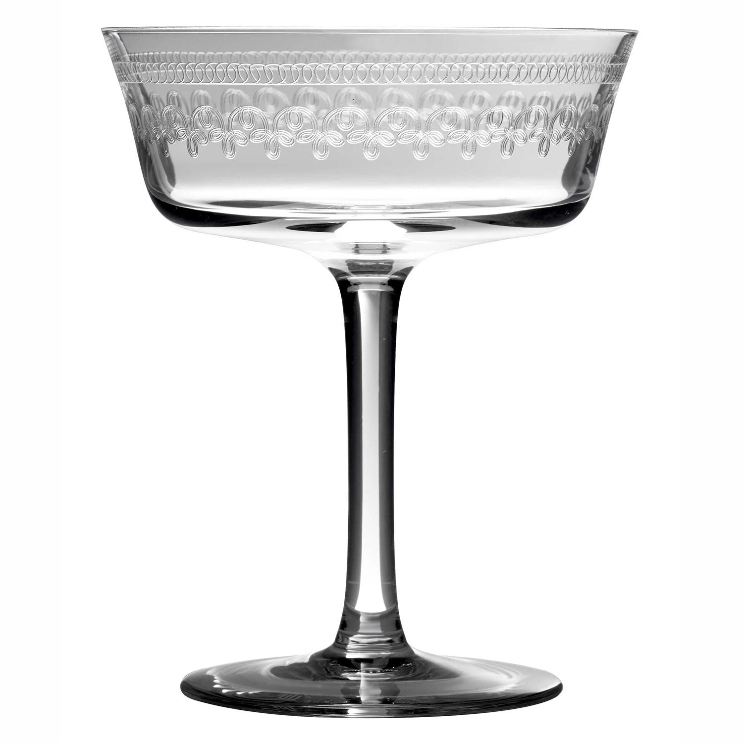 The 1910 Retro Shallow Fizz Glass is the perfect crystal champagne saucer providing a premium drink presentation. With a vintage etched aesthetic around the bowl, this coupe glass is inspired by early 20th century design. Its wide, shallow bowl compliments champagne and cocktails through brilliant transparency and retro etching.
