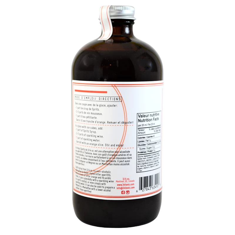 Spritz syrup from 3/4 oz is a non-alcoholic alternative to Italian-style bitter aperitifs. With its taste of bitter orange and its acidic finish, it pairs splendidly with sparkling wine in a spritz cocktail, or even simply with sparkling water. It can also be used to prepare a Negroni or a Manhattan with a lower alcohol content.