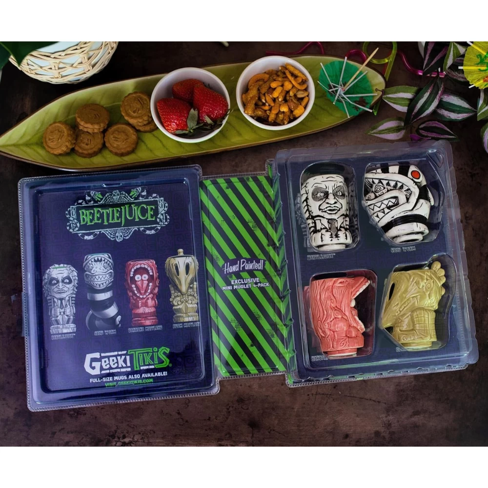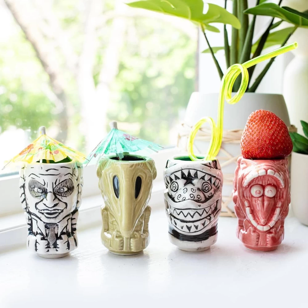 Something strange and unusual is creeping up on your tiki bar. Beetlejuice, Adam, Barbara, and a Sandworm are all brought together in this set of 4 mini mugs. It’s always showtime with this spooky crew around. This spirited collector’s set pays tribute to Tim Burton’s cult classic, Beetlejuice.