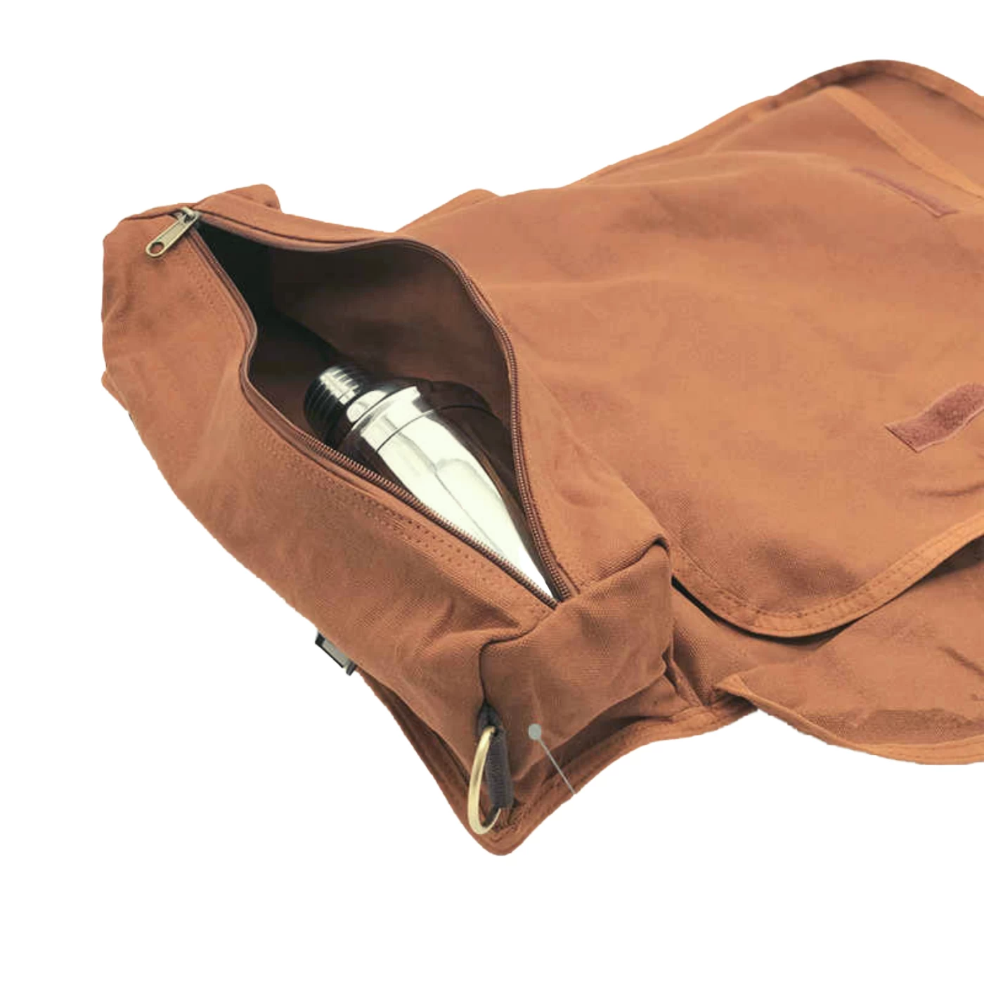 This cloth bag features a zippered compartment for your shaker and several inner slots for all your essential bar tools. The velcro flap design ensures that tools stay put when you’re on the move. Bag features a comfortable handle and a detachable, adjustable shoulder strap.Â