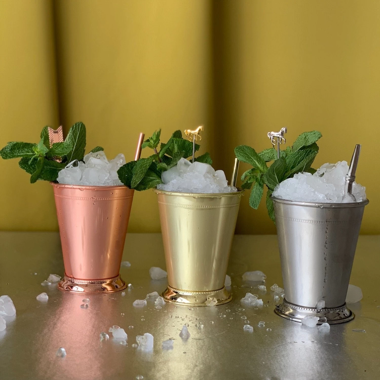 Derby day ready, with a copper flare! Serve up classic Mint Juleps or any tasty libation served on crushed ice in this copper-plated stainless steel cup.Â