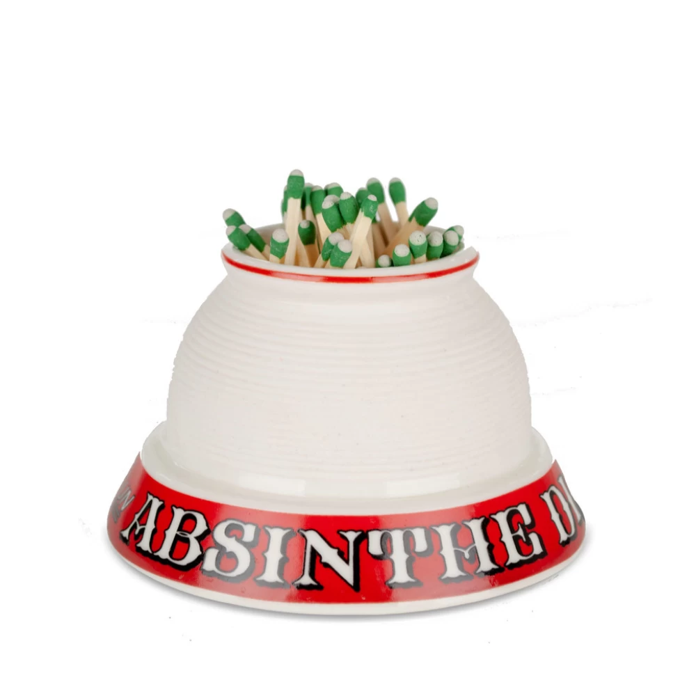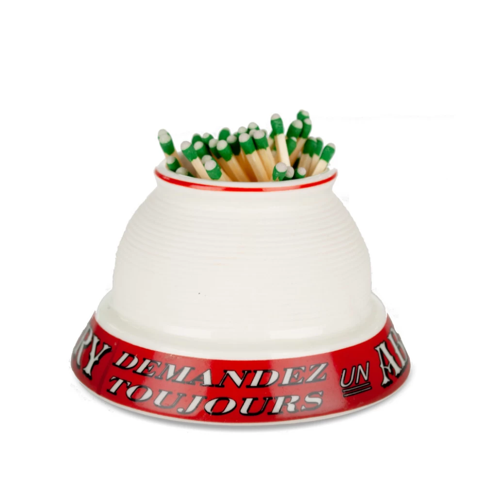 This unique match strike (or pyrogène in French) is a reproduction of those found throughout late 19th and early 20th century Europe. At that time, it was common to see a match striker sitting on a bistro table or bar. The strikers served three purposes. First, the hollowed-out top was used to store matches. Secondly, its side or base (with its ribbed surface) was used to strike and ignite the match. And lastly, the piece served as an advertising venue. Many distilleries used these match strikes to promote their liquor, and were usually provided to the bar for free.