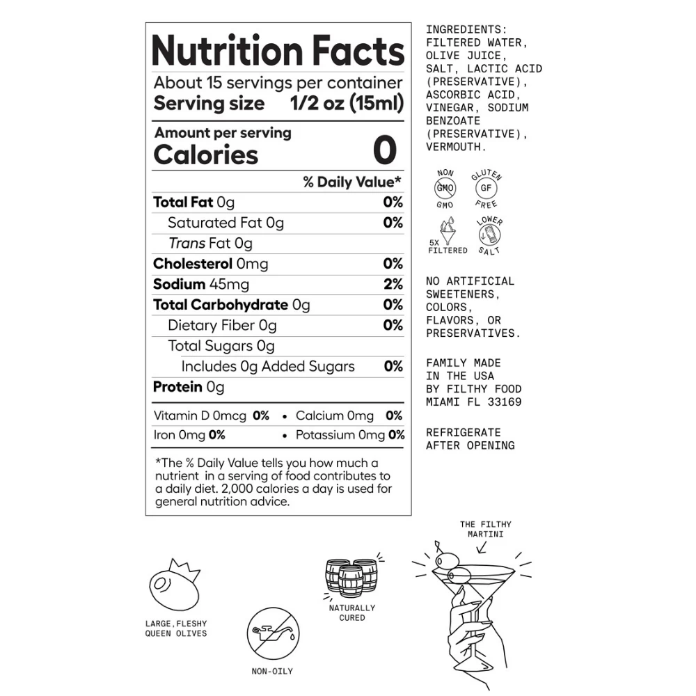 Want to experience the “The Worlds ‘Cleanest’ Dirty Martini”? Filthy provides a delicious, balanced option with their oil-free brine that contains vermouth. This brine goes through an extensive filtering process, removing all the impurities usually associated with olive juice. This flavourful, clear and balanced brine is uniquely blended to perfectly complement premium alcohol. Comes with an easy-pour spout.