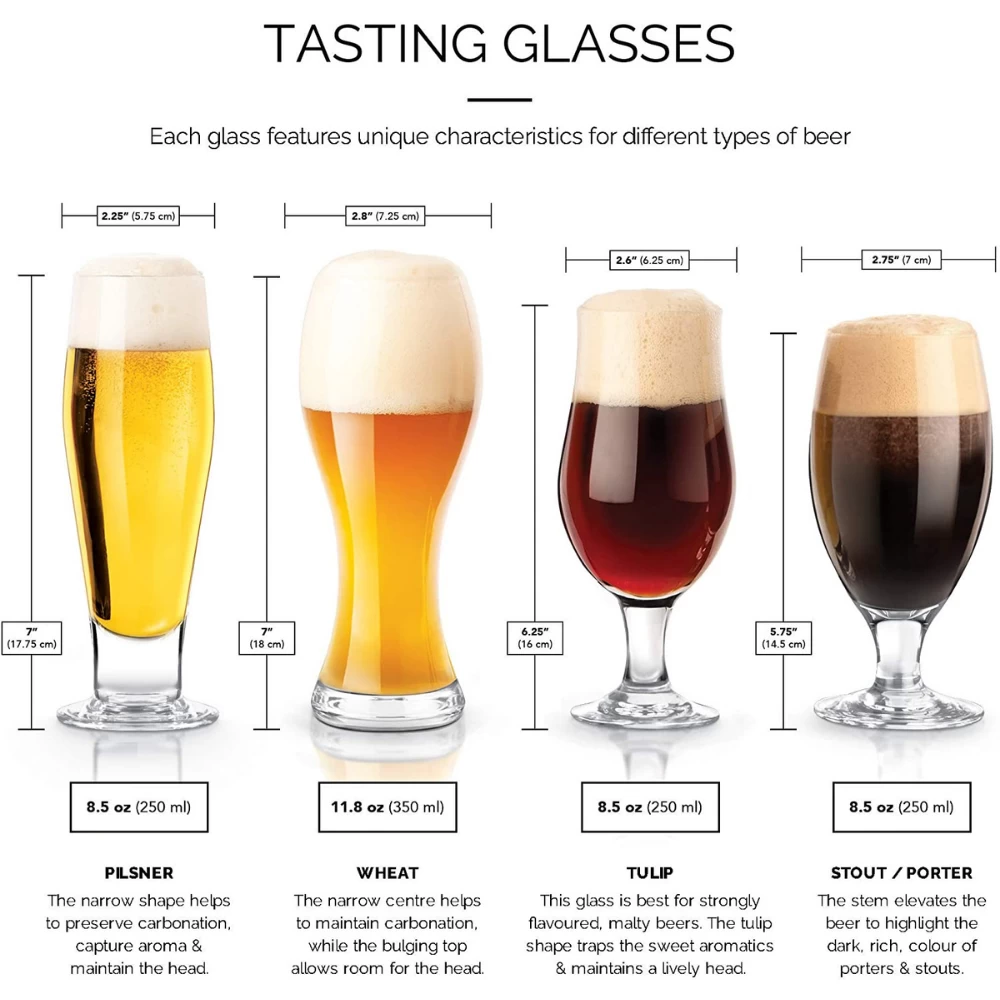 - Capacity: Wheat 11.8oz, Tulip 8.5oz, Stout 8.5oz, Pilsner 8.5oz