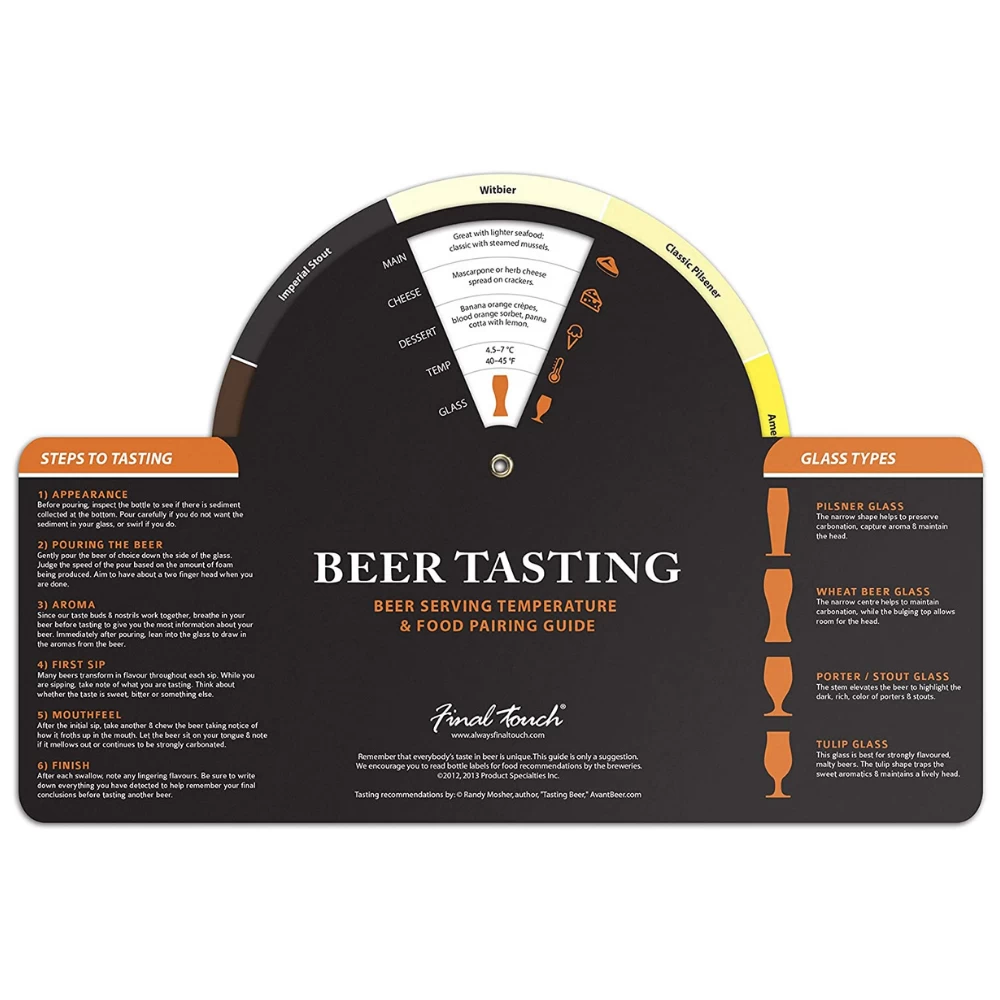This 6-piece beer tasting set by Final Touch allows you to enjoy your finest beers to their fullest. Includes: Wheat, Tulip, Stout and Pilsner glasses, wooden paddle and Beer Tasting Guide (Food Pairing, Cheese Pairing, Dessert Pairing, Serving Temperature, Glass Pairing & Steps to Tasting Beer).