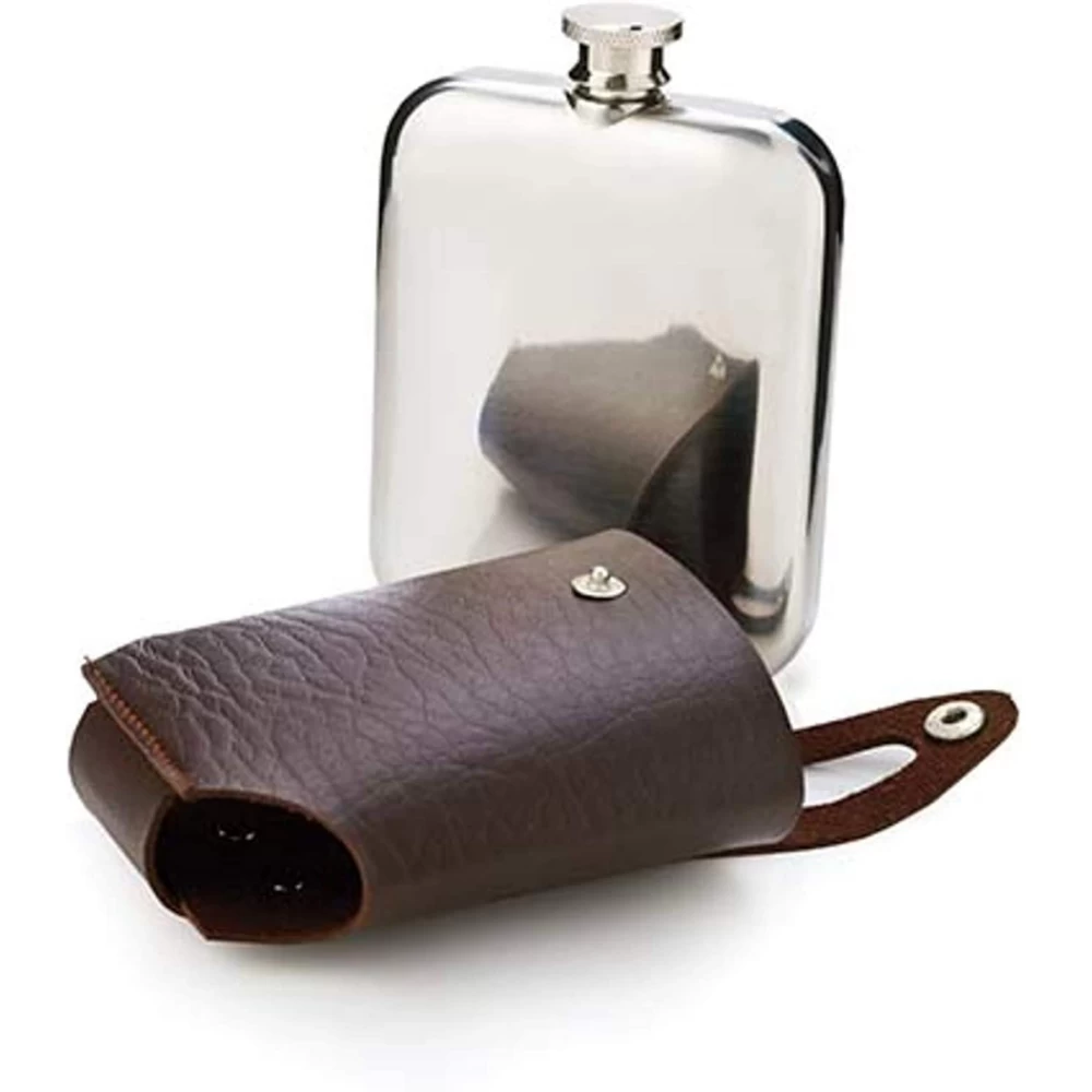 Flasks were made for voyagers. Snap your silver five-ounce vessel into a rich chocolate-brown carrying case and set off on the next adventure.