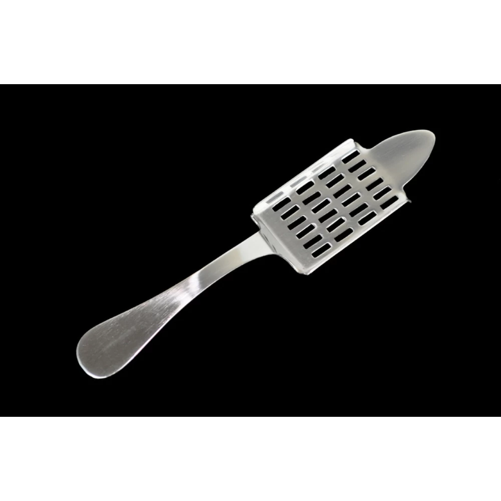 This unique spoon has one of the largest grilles of all of our absinthe spoons. Underneath the tip of the spoon has two prongs which hook onto the edge of the glass to help keep the spoon from moving. The spoon was inspired by the increasingly popular modernist designs of the time. It is an exact reproduction of a late 19th century absinthe spoon.