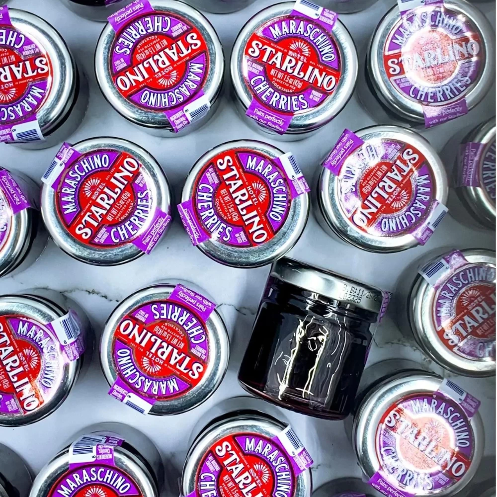 Starlino Maraschino Cherries in a handy travel-friendly jar! These cherries mature for 15 days in their natural Marasaca juice, then rest for an additional seven days to reach perfection. The result of this artisan production method is an all-natural, luxury cherry that is delightfully sweet and tart. Starlino Maraschino Cherries are made from high-quality, Italian Marasaca Cherries, also known as some of the highest quality cocktail cherries in the world. Marasaca Cherries are a type of sour Morello cherry made from Royal Ann, Rainier or Gold Varieties Cherries. The de-stoned, plump, ruby red cherries produce a small “pop” after every bite, with a distinct sweet cherry flavour experience.