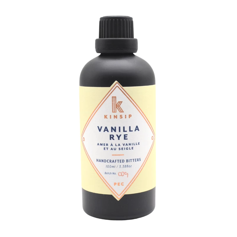 Kinsip Vanilla Rye bitters the vanilla is layered onto a dark rye whisky base. This could easily be used to add flavour in your next batch of pancakes. The vanilla complements the classic notes found in whisky and it adds a certain complexity to any dark spirited cocktail.