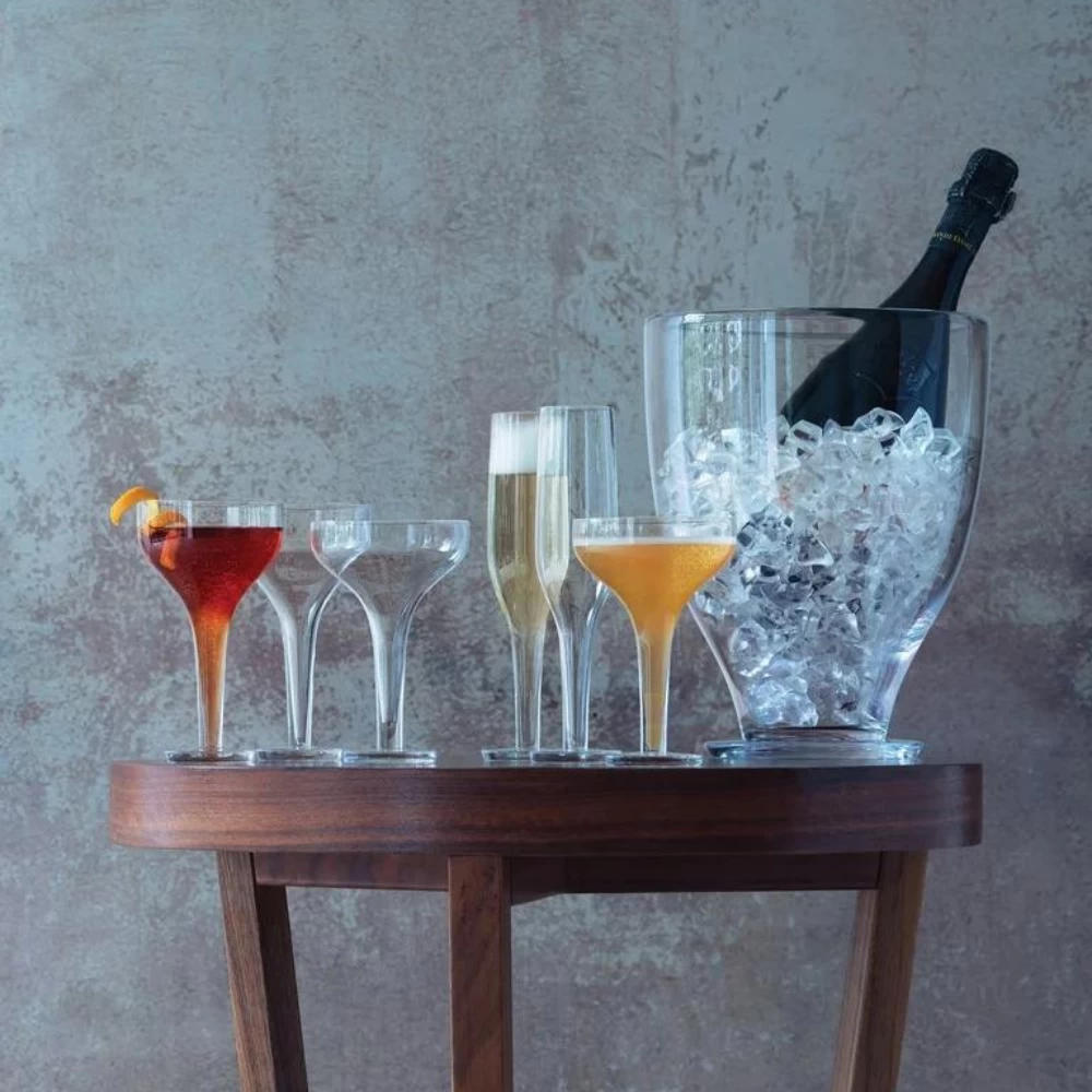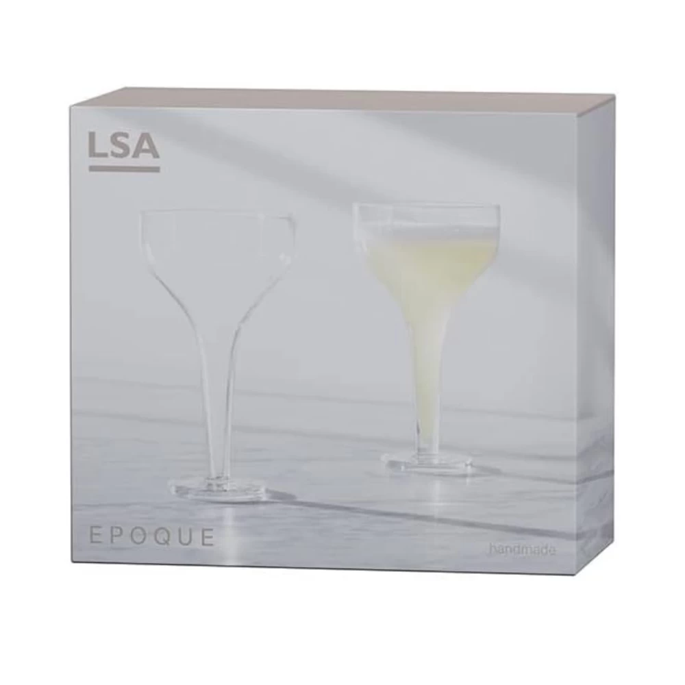 A set of two mouth-blown champagne saucers with hollow stems and disc-shaped feet, inspired by the champagne cocktail era of the 1920s. For champagne and short cocktails. The disc foot is shaped by hand using a wooden tool and applied to the stem. The fine rim is fire polished to achieve a smooth finish.