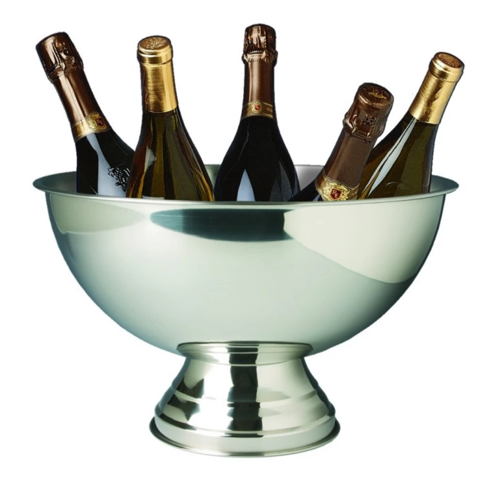 This large wine chiller can keep 4-5 wine and champagne bottles chilled. The outside of the wide wine chiller is brightly polished with a brushed finished inside. Its classic design graces a table top with pedestal base for first class presentation. The oversized 13 quart stainless steel catering bowl can chill wine or present food / punch to guests. Versatile catering bowl or wine chiller used for parties, everyday table top presentation of fruit or company events.