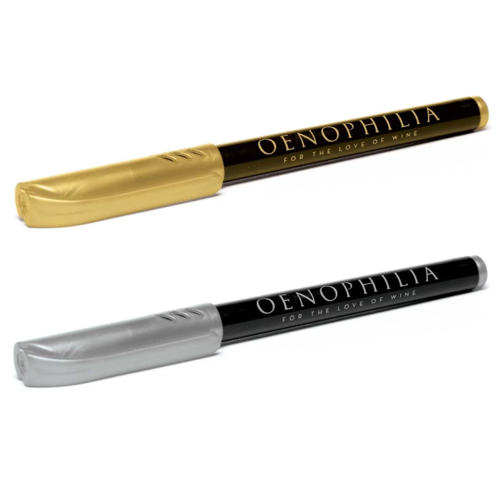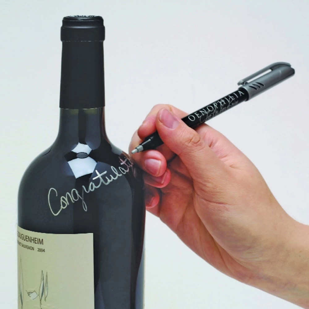 Personalize glass bottles or wine glasses. Ideal for telling apart guest’s glasses during a party. Also writes on metal, ceramic, and plastic. Metallic ink dries quickly and washes off with water. For chilled wines, write on stem of glass or above the pour line. Includes 2 pens (gold and silver).