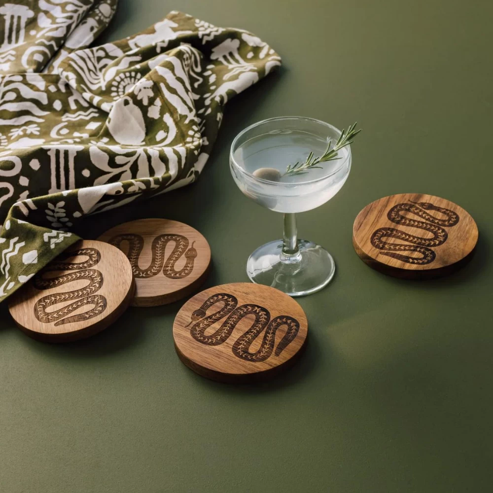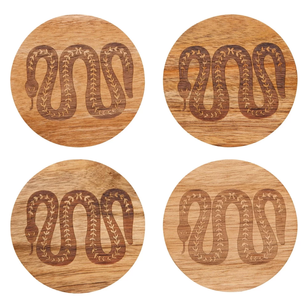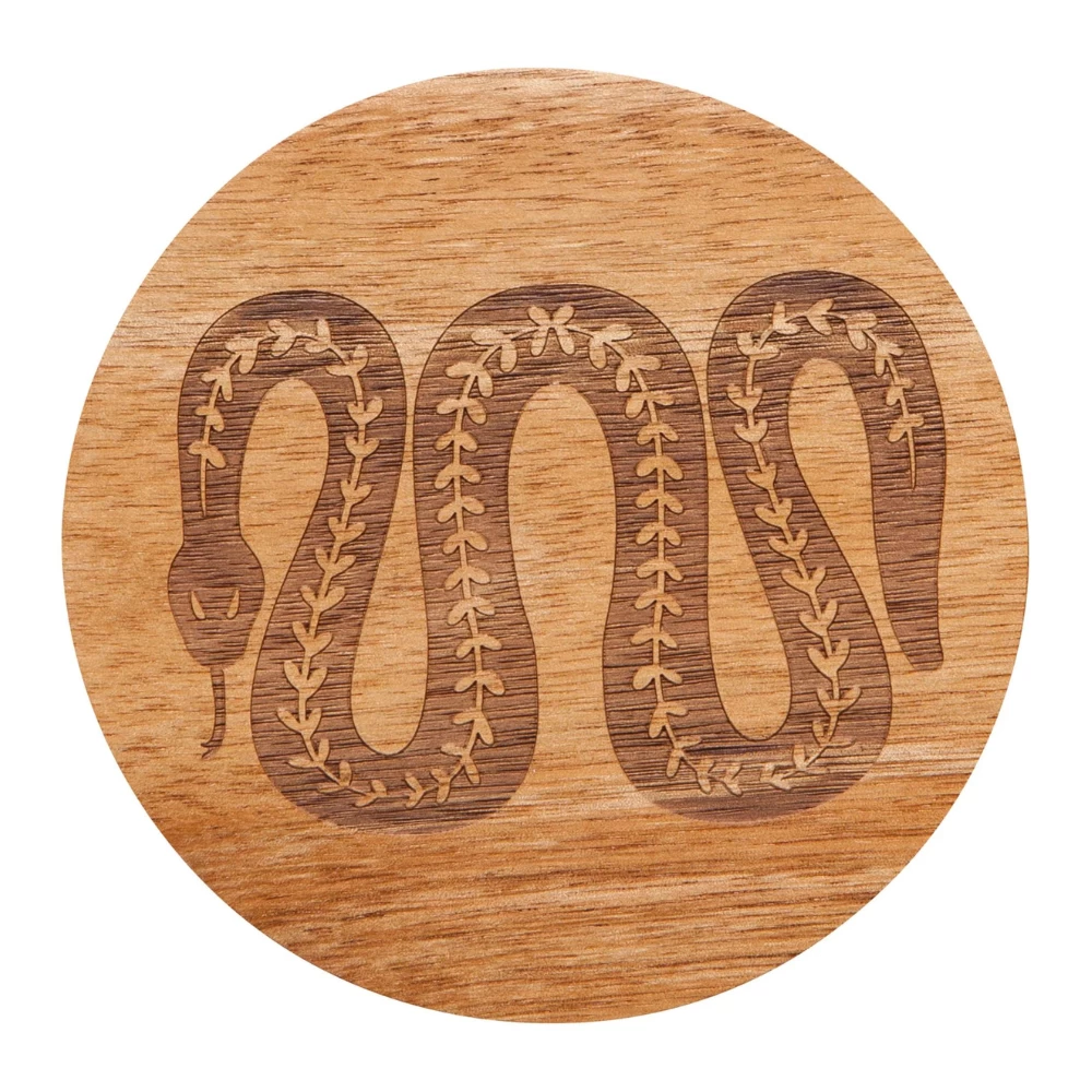 With natural acacia wood grain patterns, each coaster in these sets is truly unique. Danica Studio symbols are laser-engraved into the surface, creating a splendid medallion effect. Due to the naturally occurring wood grain patterns within the Acacia wood, each coaster will look unique. Engraved pattern may look more defined on some coasters and less defined on others, depending on final wood grain pattern/coloration of wood providing more or less contrast with the engraved motif.