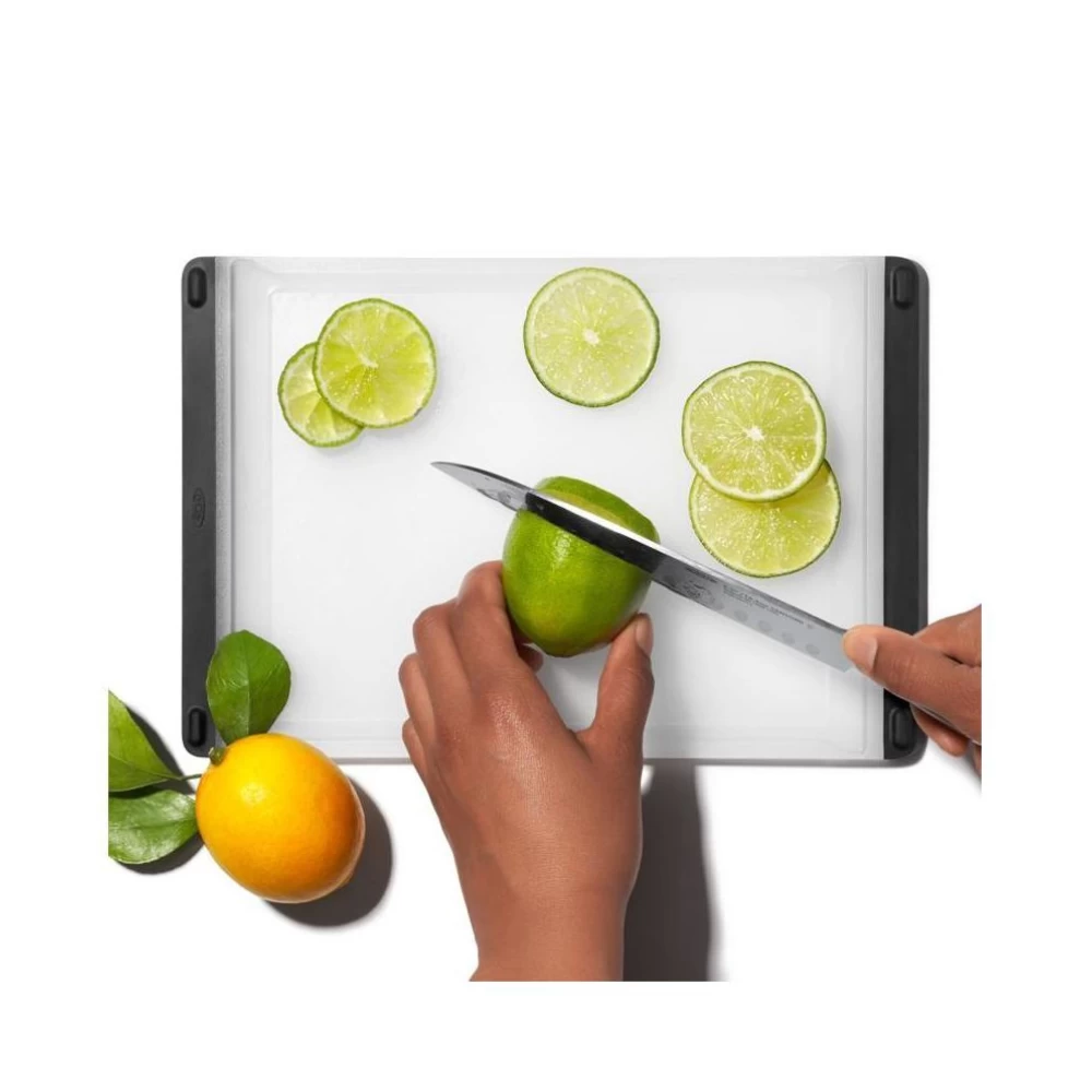 This durable, non-porous, odour-resisting polypropylene cutting board is perfect for your prep work! Featuring soft-tapered grips for easy lifting and a juice groove to retain liquids. Double-sided to prevent cross contamination. Friendly to your knives and resists deep scratches.