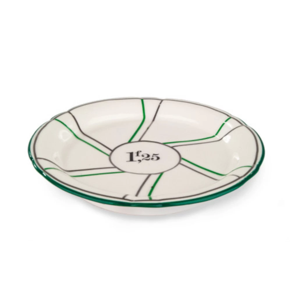 Absinthe bistro saucers served a dual purpose in the pre-ban absinthe era. Besides serving as a coaster, they also functioned to indicate the price of absinthe being served. The price printed onto the bottom or side of the saucer corresponded with a colour painted on the outside rim. This coloured rim was used to tell the waiter how much to charge the customer by reading the different saucer colours when stacked. For instance, if three green rimmed saucers were stacked, the waiter would know to charge the customer 3.75 French francs. When paying the bill, the money was generally left inside the coaster.