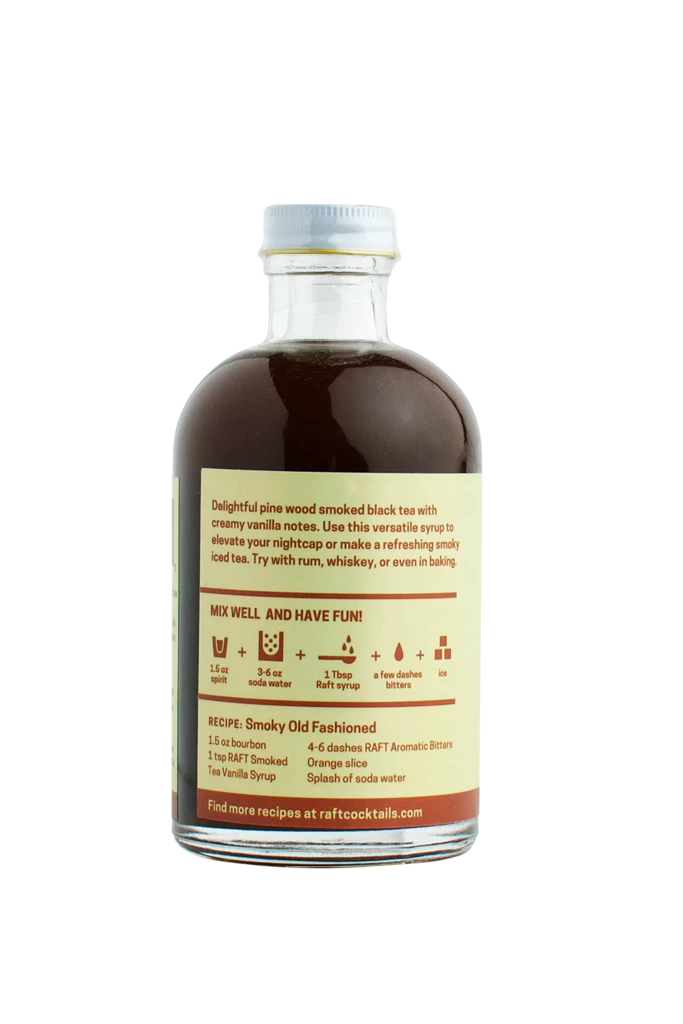 Raft Smoked Tea Vanilla delights with pine wood smoked black tea and creamy vanilla notes, and the addition of citric acid creates a rounded, balanced syrup. Use this versatile syrup to elevate your nightcap or make a refreshing smoky iced tea. Pairs with vodka, tequila, whiskey, rum, gin, or scotch. Combine with soda water for a delicious natural soda with 50% less sugar per serving than most sodas.
