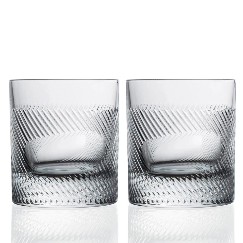 Tumbler with minimal design engravings, meticulously cut by hand. Features a heavy-weighted bottom for a luxurious sipping experience.