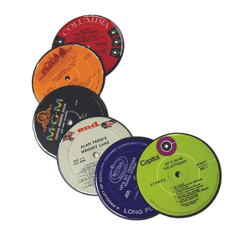 Vinylux record coasters are made from authentic vintage records and are available in themed sets of 6 mixed vintage titles. Each coaster is a timeless piece of vintage design! Coasters feature laminated record labels on both sides. They are water-resistant, and great for hot or cold drinks. All coasters come handsomely packaged in a paperboard display box.Â