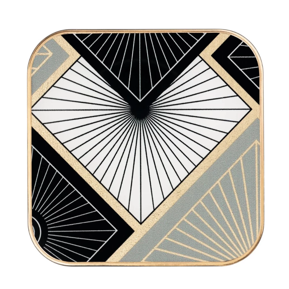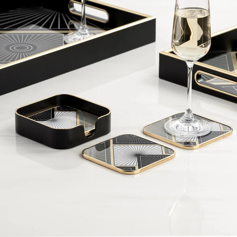 The gorgeous Art Deco inspired pattern of these glass-top coasters make them truly stand out. The plastic gold trim and glass top makes them easy to care for. Includes the storage box. Pair with the matching trays!