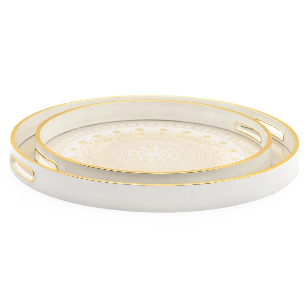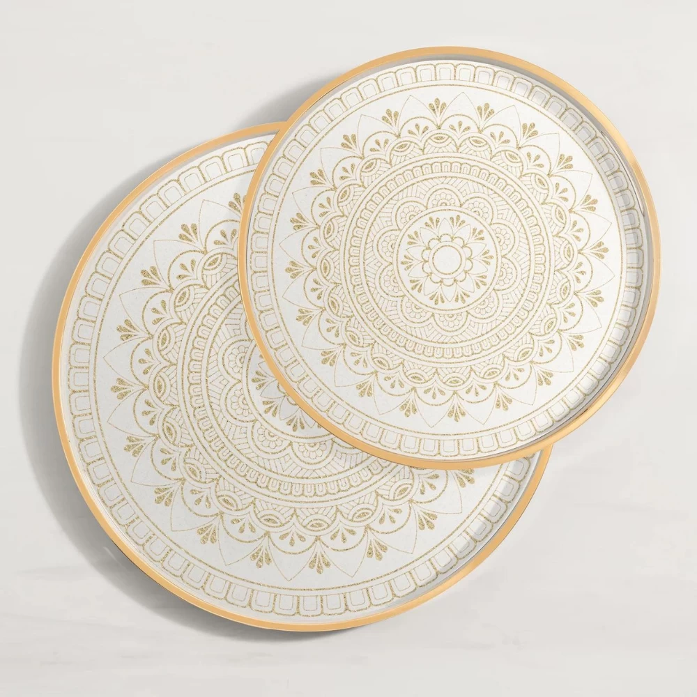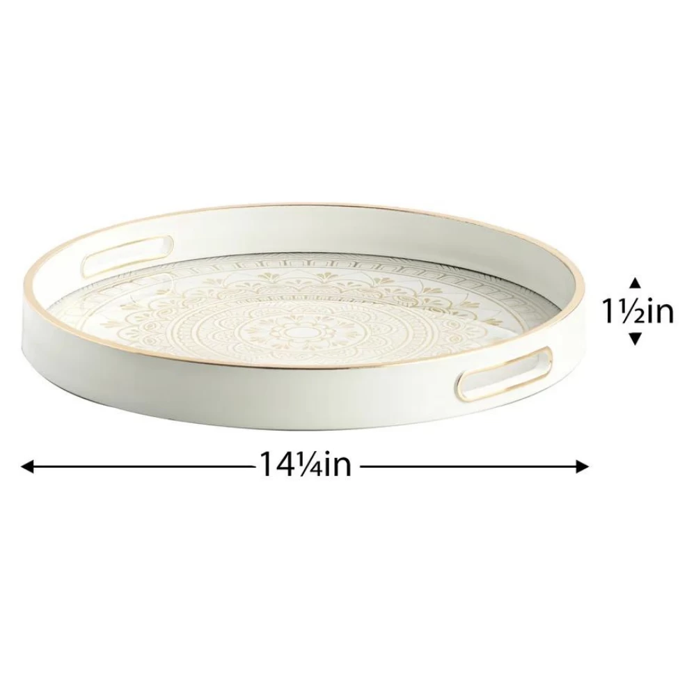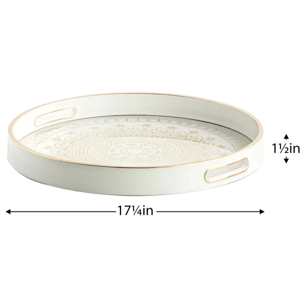 The gorgeous Art Deco inspired pattern of these glass top trays make them truly stand out. While they make a perfect serving piece, they will make any space shine when used as a decorative accent piece. The plastic trim and glass top makes them easy to care for. Pair with the matching coasters!