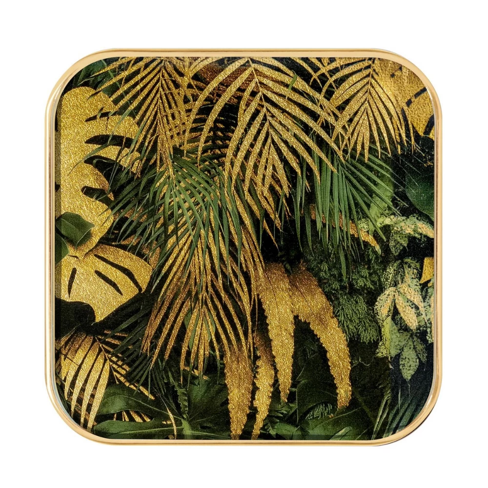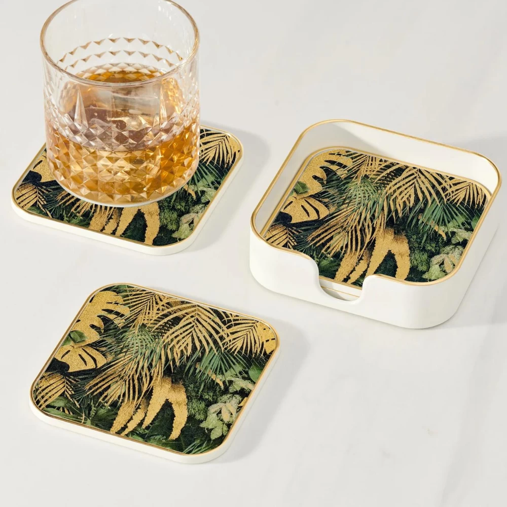 The gorgeous Art Deco inspired pattern of these glass-top coasters make them truly stand out. The plastic gold trim and glass top makes them easy to care for. Includes the storage box. Pair with the matching trays!