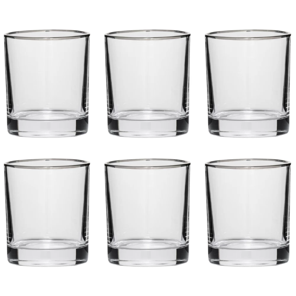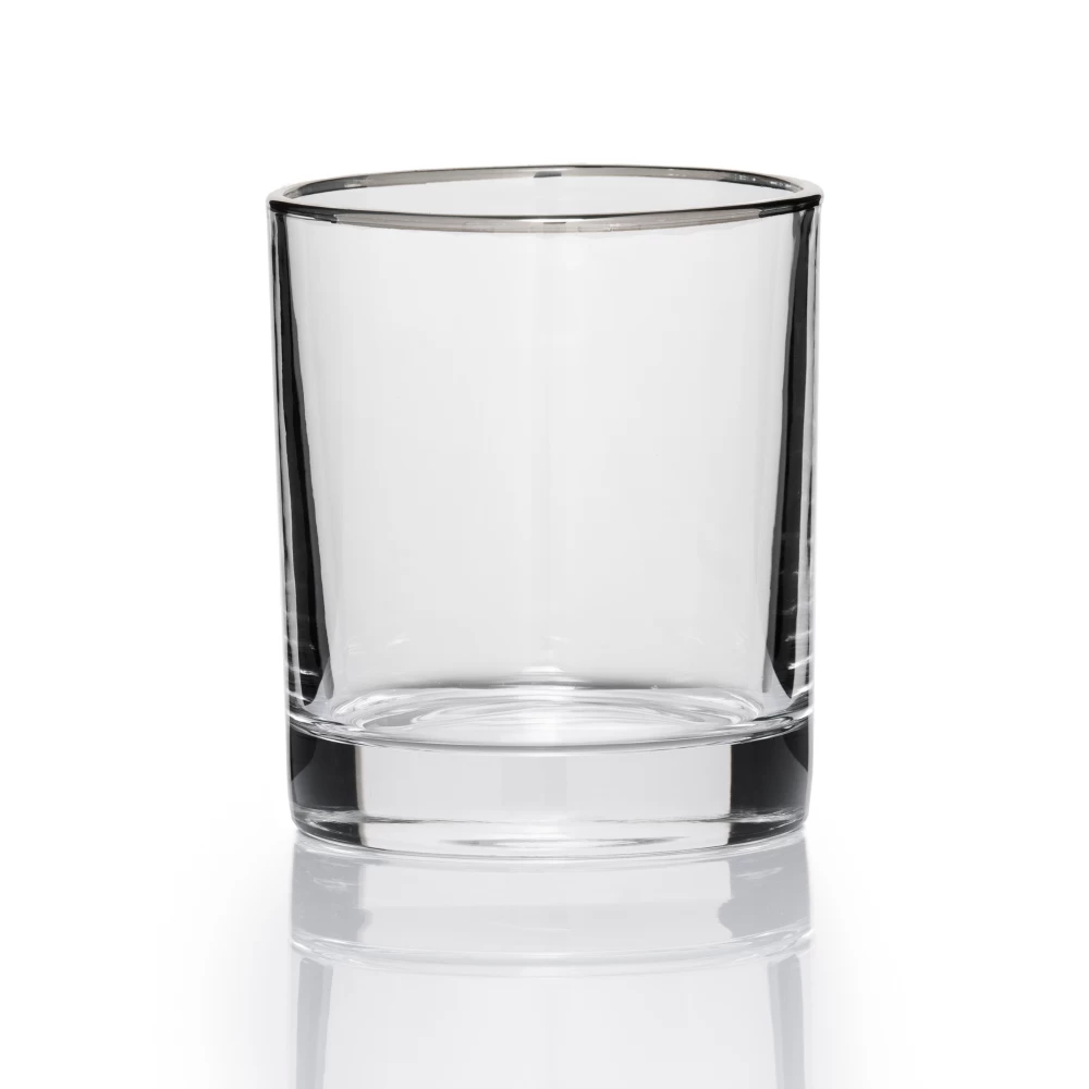 This sturdy old fashioned tumbler has a heavy base and delicate silver rim.