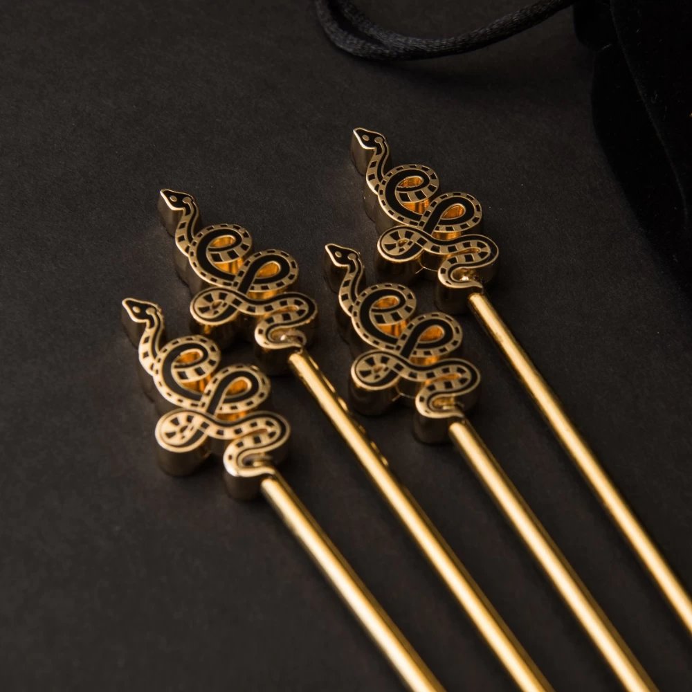 Serpentine swizzlers to gussy up your drinks. An alluringĀ stir stickĀ adorned with elegantly coiled snakes, ready to tempt you with another beverage.