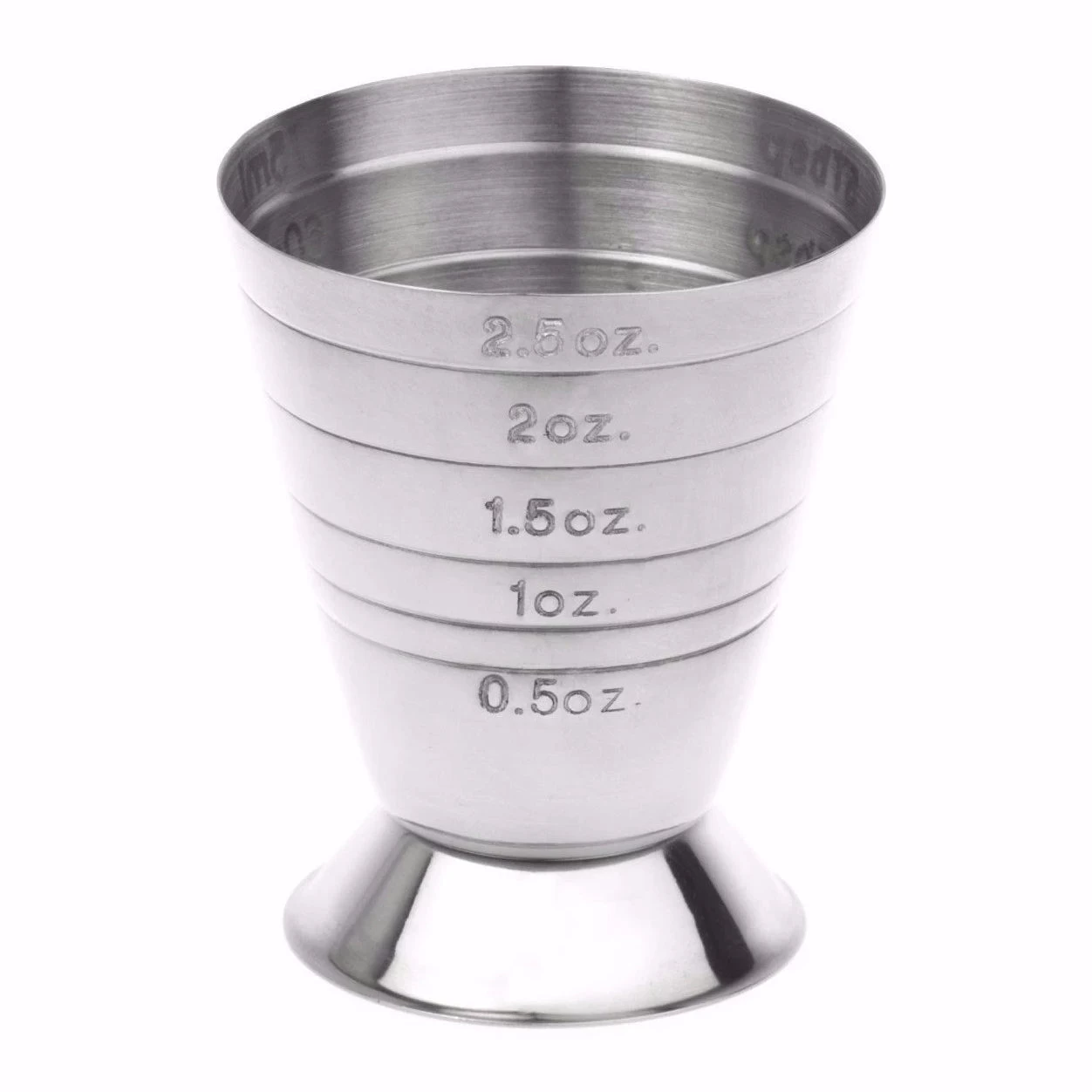 The stainless steel multi-level jigger measures in ounces, millilitres, and tablespoons.