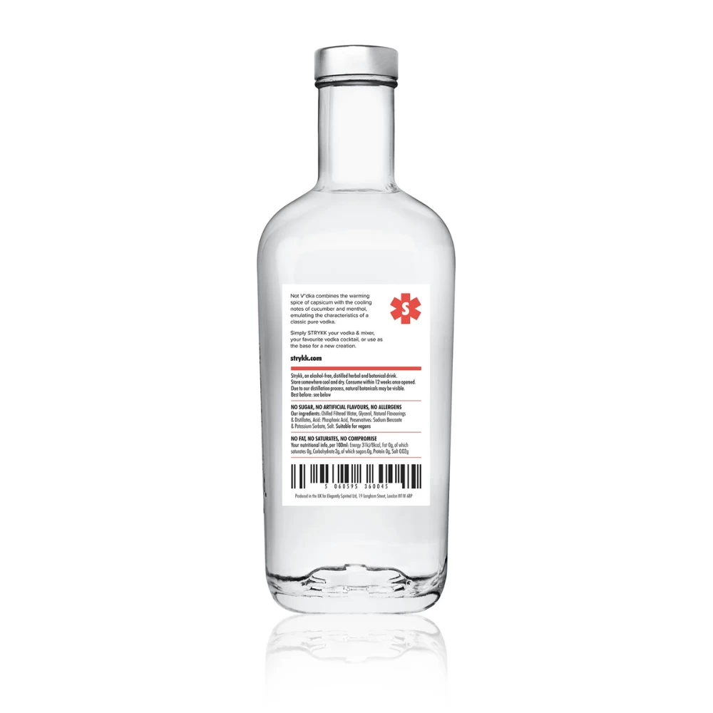 Strykk Not Vodka delights with a refreshing blend of lemongrass and capsicum, offering a crisp and invigorating experience reminiscent of traditional vodka without the alcohol. Try it in place of alcoholic vodka in your favourite cocktails like Vodka & Tonics, Mules, Pornstar Martinis and Bloody Caesars. Lovingly crafted in the UK with the finest botanicals.