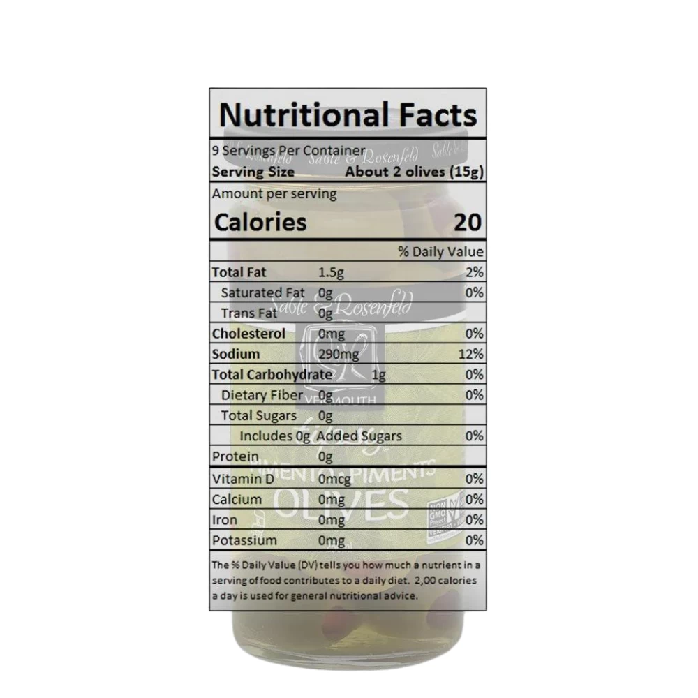 Ingredients: Green olive, water, minced pimento (sodium alginate, guar gum, calcium chloride, potassium sorbate (preservative)), salt, lactic acid, sodium benzoate (preservative), vermouth.