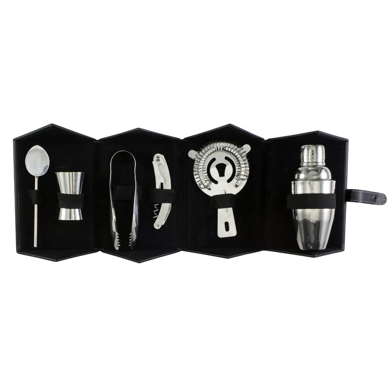 6 piece Bar Tool Set, with fold-out storage case. Includes a small shaker, double-sided jigger, hawthorne strainer, waiter’s corkscrew, ice tongs, and bar spoon.