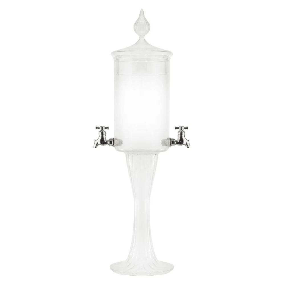 Proper use consists of: pouring an ounce of absinthe into an absinthe glass, then placing an absinthe spoon on top of the glass and a sugar cube atop the spoon. The lid of the fountain is removed and fresh water and ice is added into the glass bowl. The spigot is slightly turned and the ice water is slowly dripped from the fountain onto the piece of sugar. The cold sugar water then drips from the spoon into the glass of absinthe releasing oils and perfuming the air with fennel, grand wormwood and anise. The combination also begins to turn milky white in colour, as the water mixes with the anise. Refresh water before each use.Stands approximately 18.5″ (47 cm) tall (with lid).