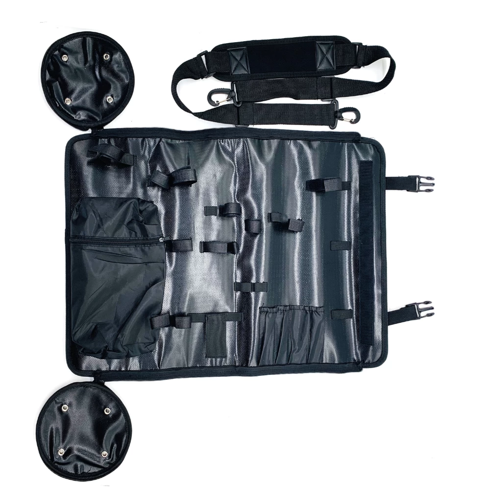 This bar tool roll-up is perfect for transporting every type of bartending tool you need on the go. Available with or without 18 essential bar tools depending on your needs. It is a high quality black vinyl material with several Velcro and elastic inserts designed to hold your tools securely in place while traveling. When open, it lays flat displaying your array of tools and then easily rolls up and zips and snaps shut when not in use. The straps are adjustable to accommodate bartenders of differing heights and sizes.