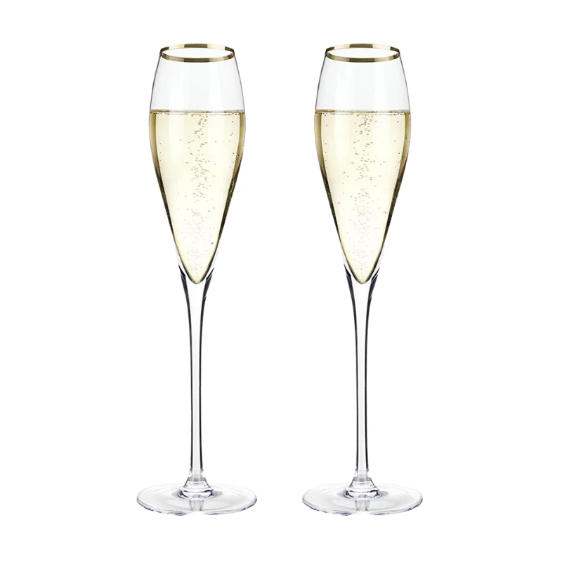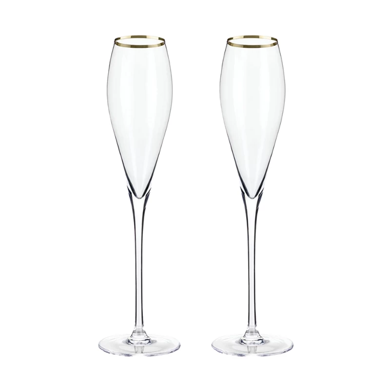 Raise more toasts with our festive pair of gold embellished champagne flutes! Crystal made and decorated with the lightest trace of gold along the rim, this is a set that is sure to stun.Â