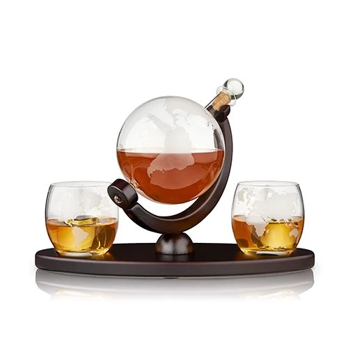 The Globe Decanter & Whiskey Tumblers Set by Viski is the perfect way to enjoy high-end liquor in style. This striking set is etched with the continents of the world, creating a beautiful frosted look that perfectly displays the liquid within. Each tumbler features subtle curves to help capture and concentrate aroma for a wonderful nosing experience.