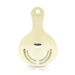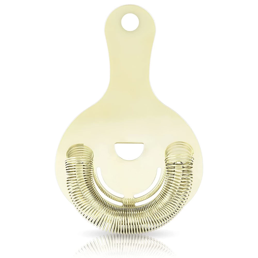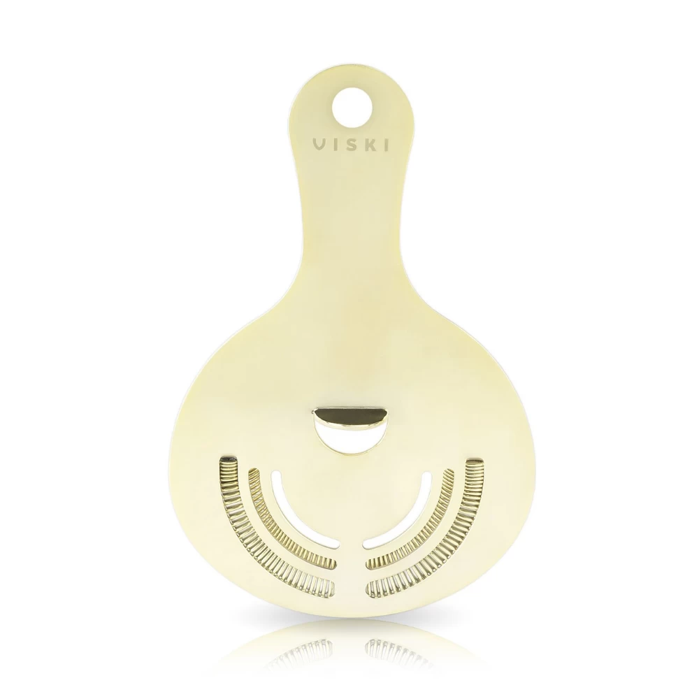 An unobtrusive flat handle, broad face and tightly coiled spring define the Viski professional-grade gold Hawthorne strainer, while two symmetrical sets of perforations provide the bonus of making split pours second nature.